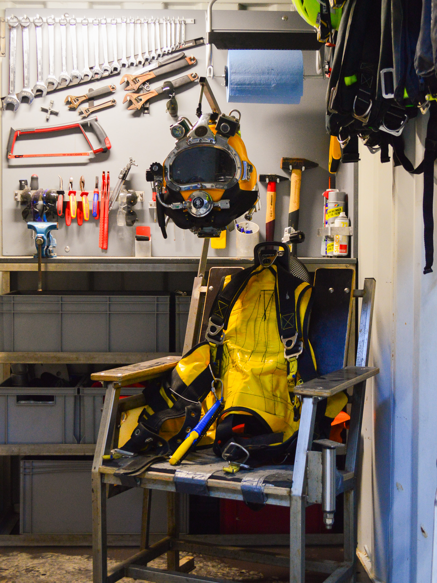 The Aquatech Group Deck Store serves as a sheltered standby area for the diver and as a practical storage unit for daily tools and consumables used during diving operations. The unit is equipped with a video screen including diver audio for continuous monitoring and provides storage space for a broco cutting set, small tools and essential consumables. Thanks to the specially designed access point, diving helmets can be safely stored inside the container without disconnecting from the umbilical, both in port and during transit.