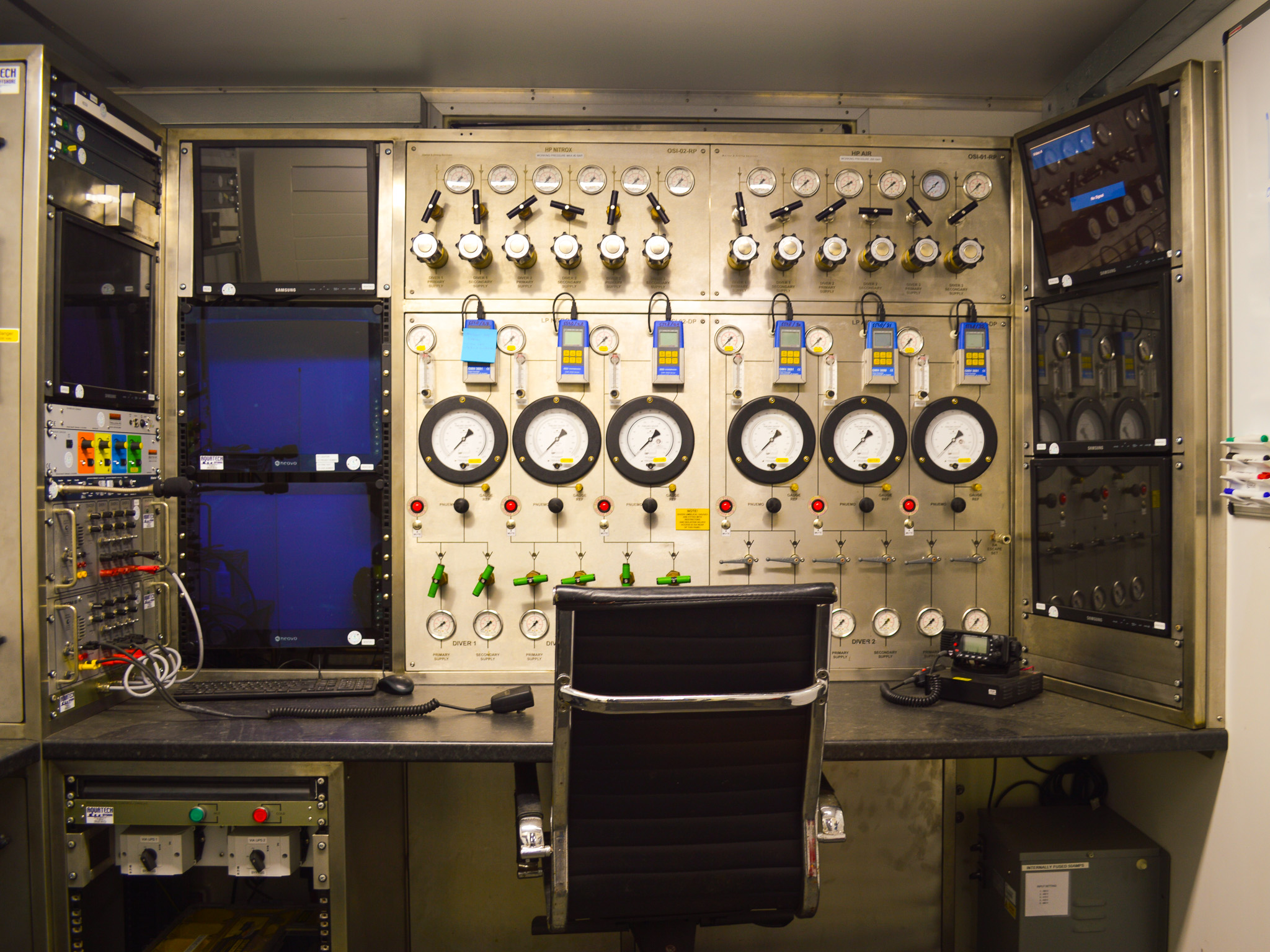 The Aquatech Group Dive Control unit is a fully equipped DNV 2.7-1 certified diving control container, designed for safe and efficient professional diving operations. Built into an insulated 12 x 9 ft container with air-conditioning and heating, the unit features a 3-diver air panel and a 3-diver Nitrox panel, providing maximum operational flexibility. With extensive air/gas storage, integrated video and communication systems, redundant power supplies and comprehensive back-up systems, this unit ensures full control during critical offshore projects. The Dive Control unit is supplied complete with umbilical racks and Kirby Morgan diving helmets.